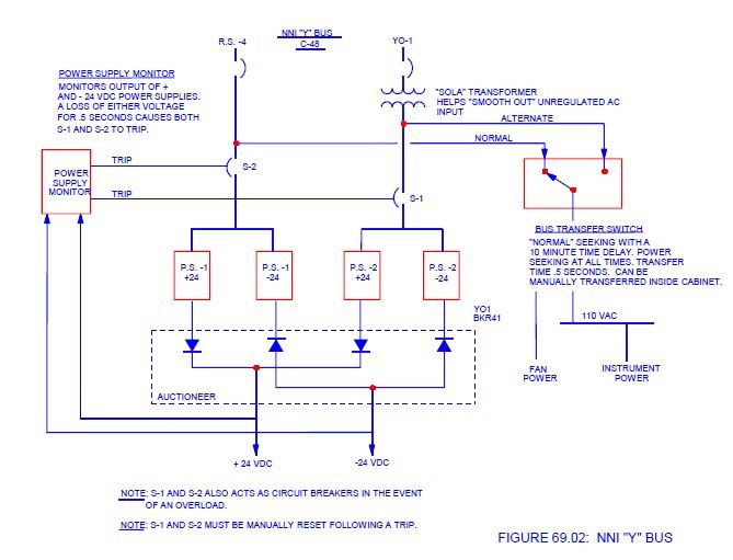 Power supply monitors acre auctioneered to provide a (+) and (-) 24 volt signal. Loss of either the +/- 24 volts will cause both S-1 and S-2 breakers to trip and loss of power.