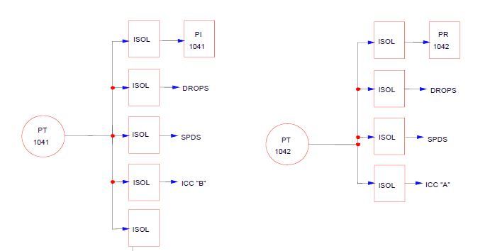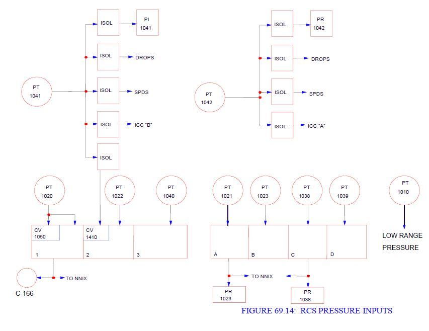 ES analog channels 1 & 2 wide range RCS pressure instruments (PT-1020/PT-1022) input to 1050/1410.