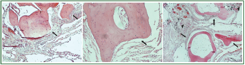 Figure 7. Hematoxylin and eosin, original magnification ×100, ×200, ×40. Histopathology of pulmonary ossification. A branching fragment of bone containing marrow protruding into alveolar spaces (arrows). Note the anthracosis (dark brown carbon dusts) of the interstitium (arrowheads).