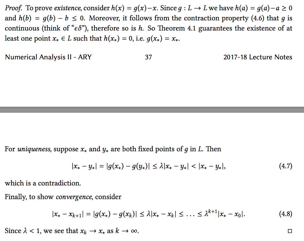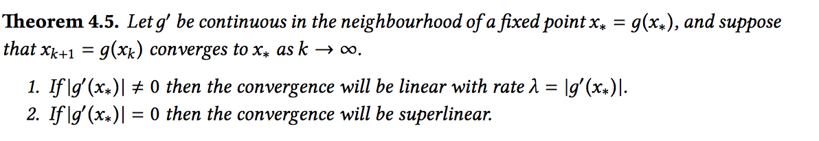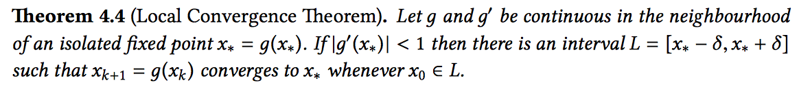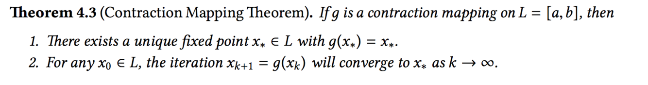 Transform f(x) = 0 into the form g(x) = x, so that a root x* of f is a fixed point of g, meaning g(x*) = x*. To find x*, we start from some initial guess x0 and iterate xk+1 = g(xk) until |xk+1 - xk| is sufficiently small.