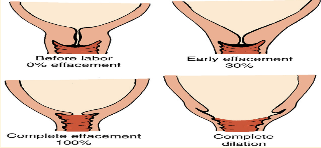 *Effacement means that the cervix stretches and gets thinner. Dilatation means that the cervix opens. As labor nears, the cervix may start to thin or stretch (efface) and open (dilate).