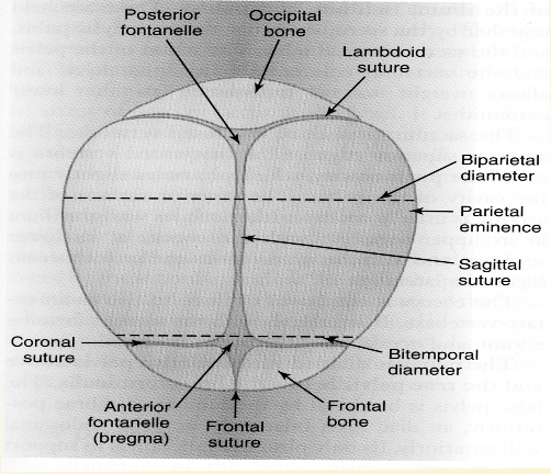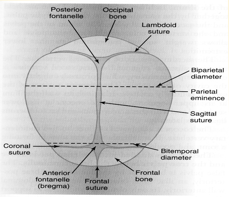 -The widest part is the Biparietal diameter, the skull is formed of seperate bones which mould together during the mechanics of birth.
