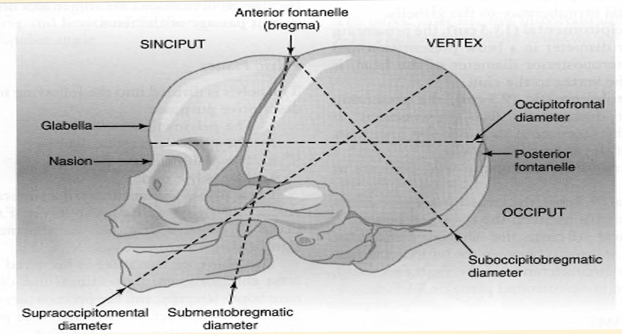 In normal birth mechanics, the OCCIPUT (back of the skull) presents anteriorly at the outlet of the pelvis. As the fetus’s head flexes, the smallest diameter is then presented to accommodate the limited space. This is called the SUBOCCIPITOBREGMATIC DIAMETER or the diameter running from under the back of the skull on to the anterior fontanelle or the Bregma.