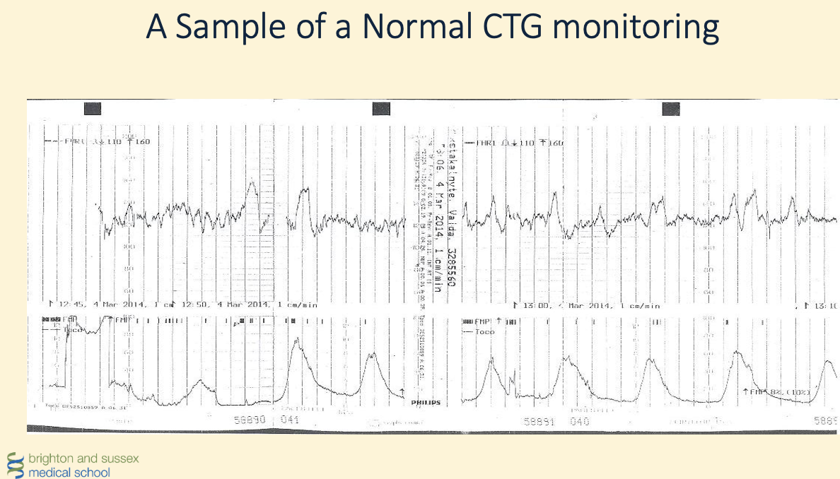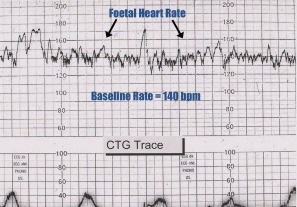 Any abnormality heard would lead to the use of the CTG. Cardiotocography (CTG) is a technical means of recording the fetal heartbeat and the uterine contractions during pregnancy.
