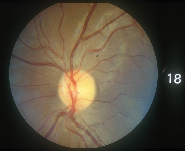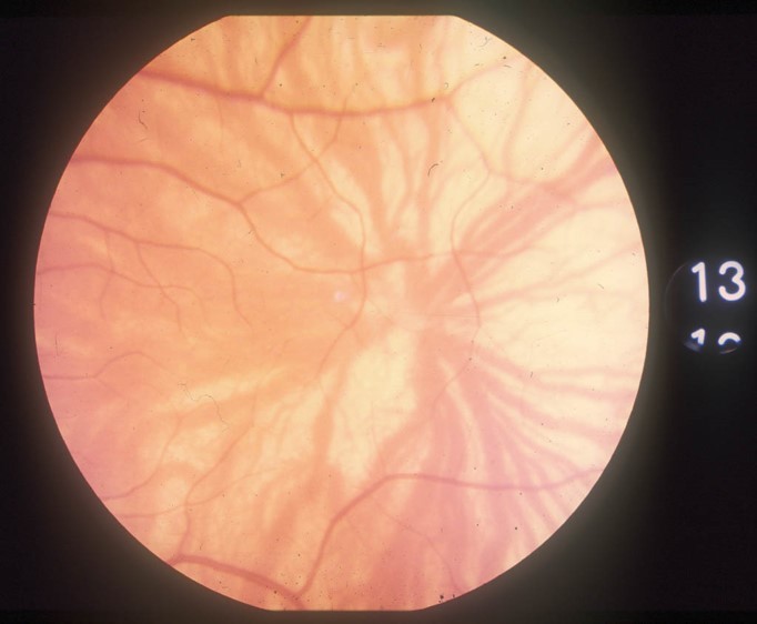 Virtually no pigment in RPE or choroid, so can see through layers of the choroid and RPE thus blood vessels of underlying choroidal circulation can be seen too.