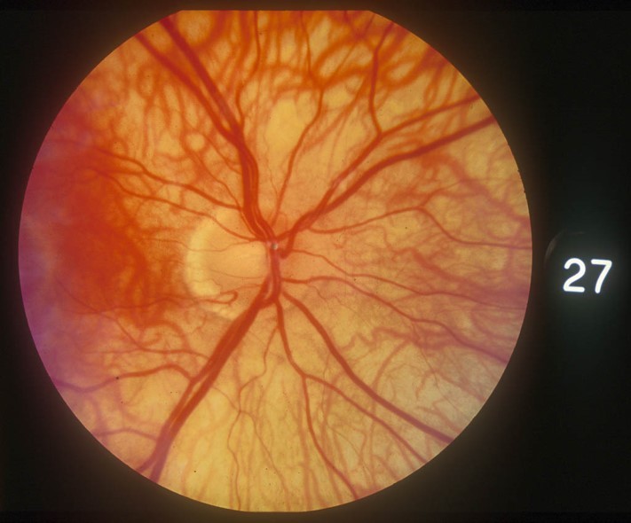 Scleral indentation (can see all the way around into the periphery). Here an instrument is pressed onto the side of the eyeball thus pushing the fundus into view of the direct ophthalmoscope.