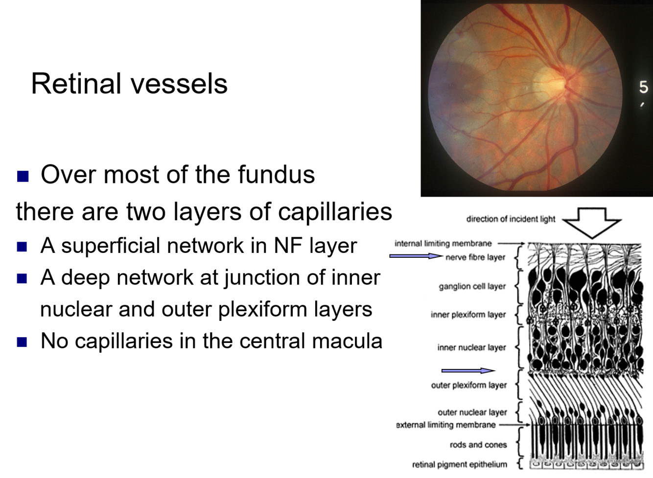 The purpose of retinal vessels is to supply oxygen and other nutrients from the blood to first six layers of the retina.