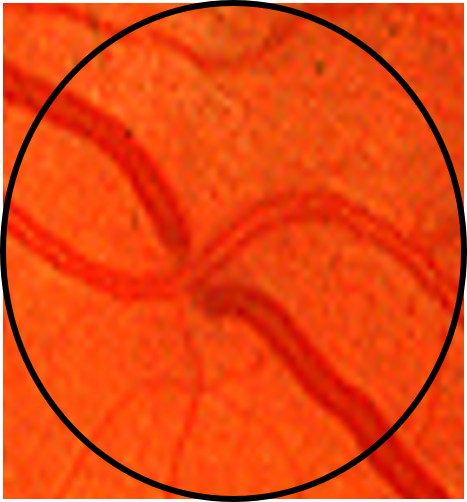Retinal vessels normally curve very gently with no deflections (no changings of path) at the A/V and V/A crossings.