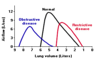 On a diagram of airflow and lung volume, where does the curve of obstructive lung disease shifts?