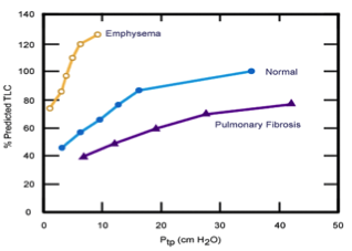 The relationship between volume and pressure, a measure of how stiff a lung is (stiff lungs have low compliance)