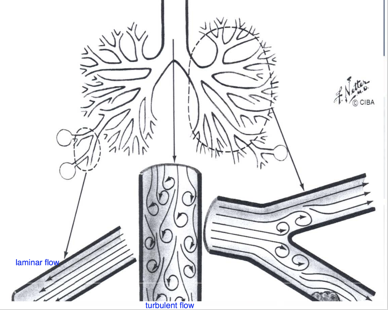 The nature of the flow changes as the gas moves from the mouth to the alveoli and back again