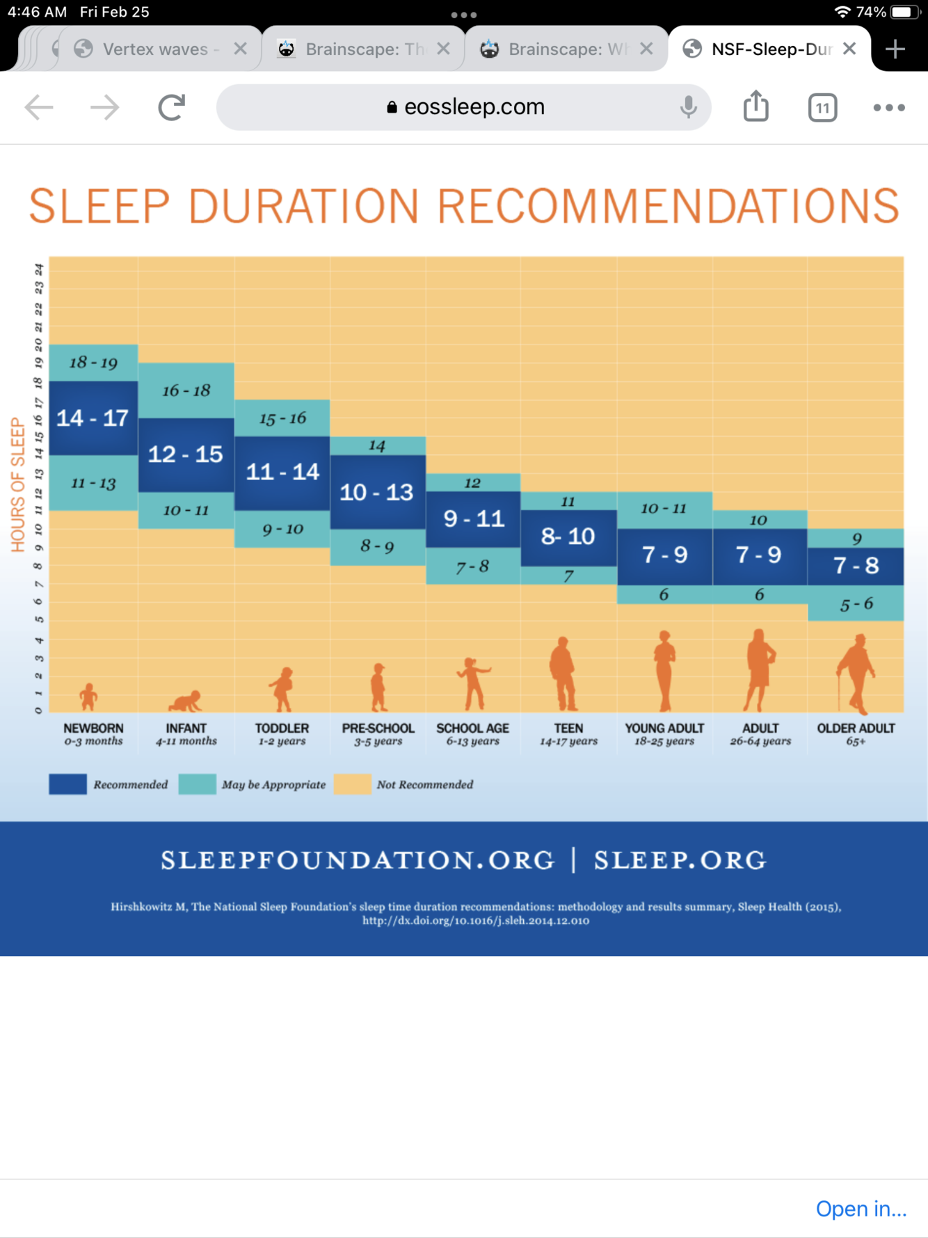 11 to 14 hours sleep per day (1.5 to 2.5 hours napping)