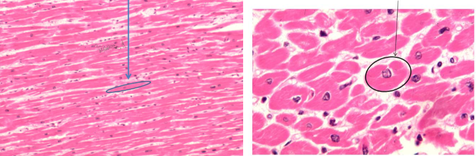 A - Cardiomyocyte (seen longitudinally), nucleus in centre