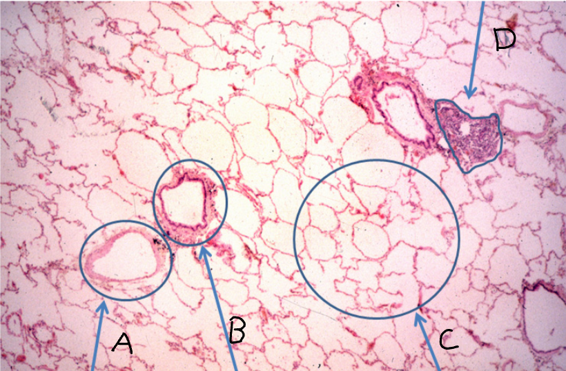C - Alveoli filled with air, very thin wall lined with epithelial cells and contains capillaries (can’t see at this magnification)