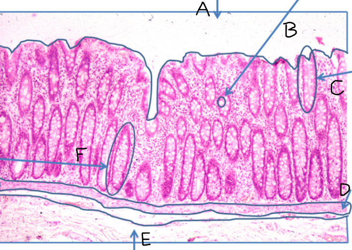 D - Mucosal layer, can see pale droplets of mucin within goblet cells