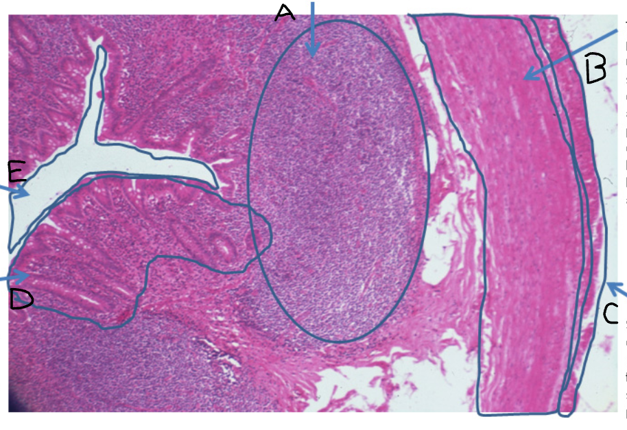 E - Submucosa, outer serosal layer, lies beneath mucosa and the supporting muscularis mucosae
