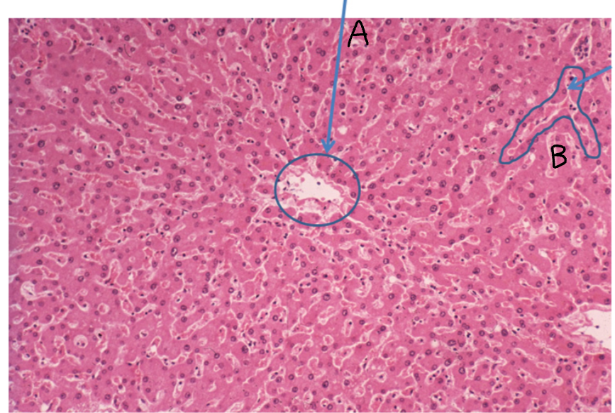 A - Central vein, blood leaves liver and re-enters circulation (another seen bottom right)