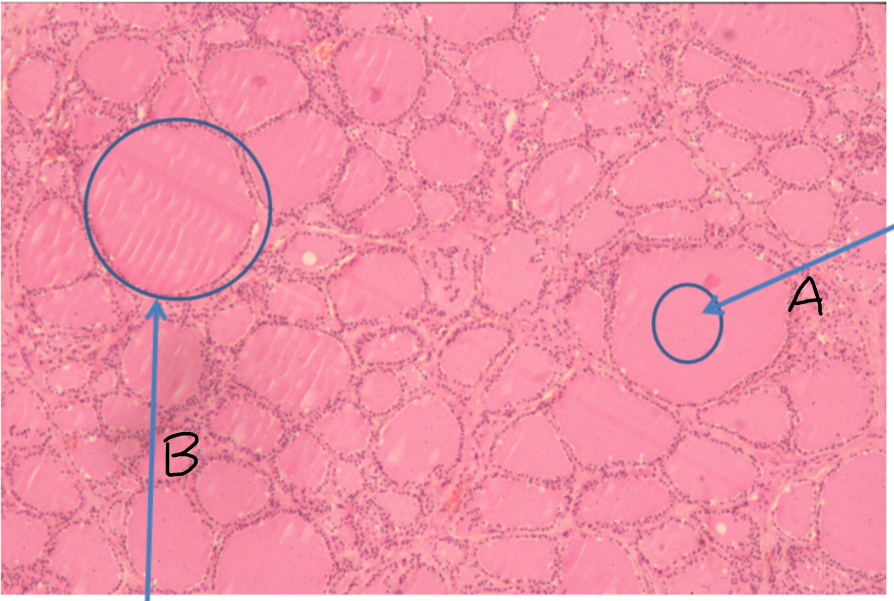 A - Colloid, pink-staining and gelatinous, precursor to thyroid hormones