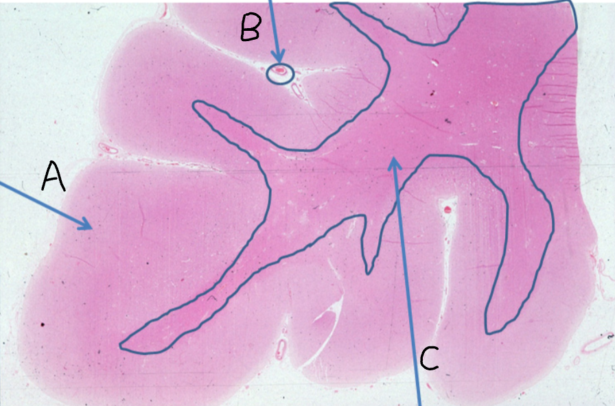 C - White matter, contains nerve fibre tracts (cytoplasmic extensions of neurons) and supporting neuroglial cells