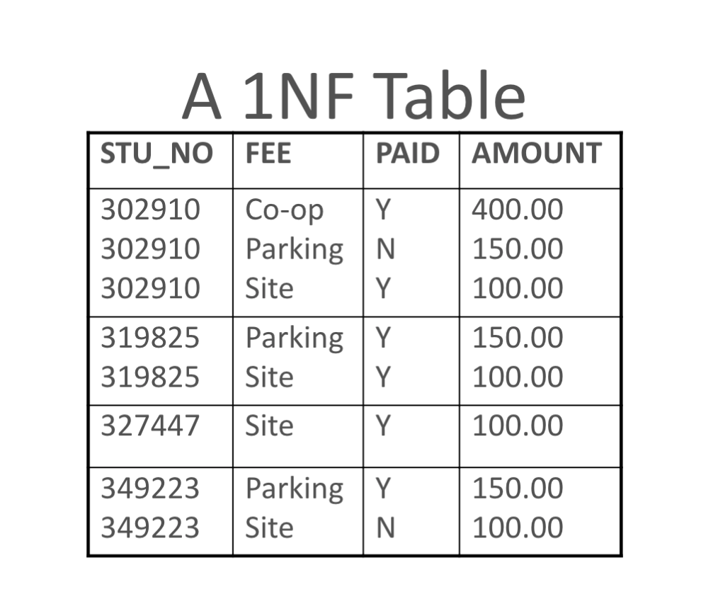 • Reduce entities to first normal form (1NF) by removing repeating or multi-valued attributes to another, child entity - To simplify, you cannot have multiple fields to capture multiple values - Most common ‘sins’ against the first normal form are the lack of a primary key and the use of repeating columns - Also, remove calculated field