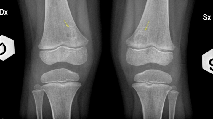 Periosteal desmoid aka cortical desmoid aka distal femoral metaphyseal irregularity (many different names-yay). This is basically an avulsion injury 2/2 repeated microtrauma. Classic location is an eccentric cortical lucency in the medial femoral metaphysis. Usually young males, and commonly bilateral.