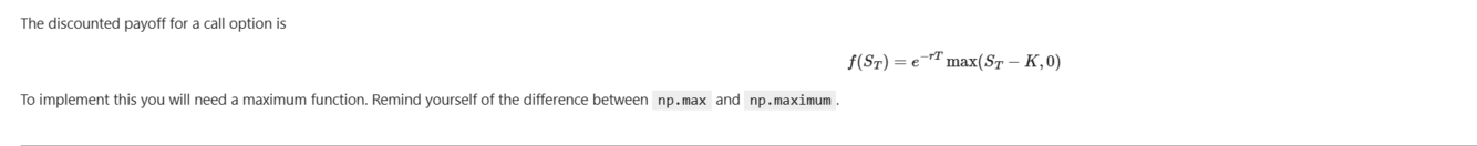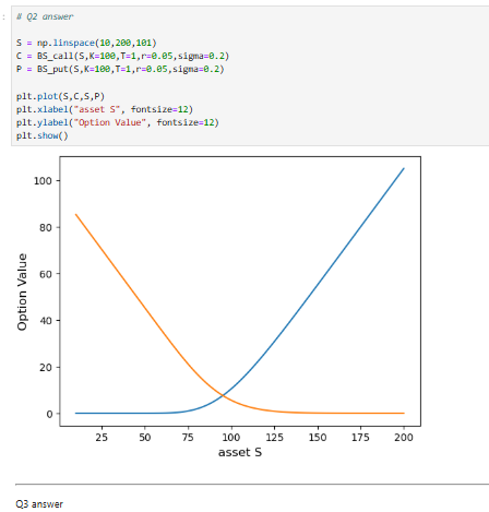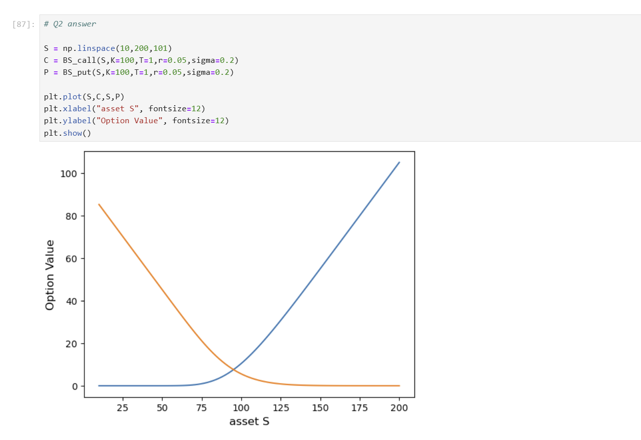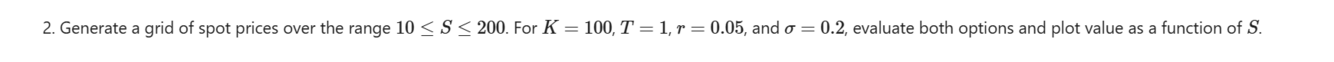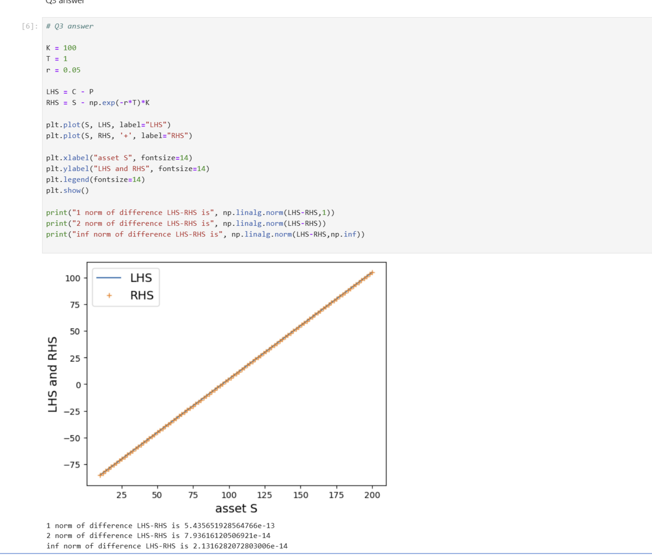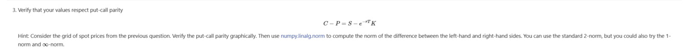 Hint: Consider the grid of spot prices form the previous question. Verify the put-call parity graphically. Then use numpy.linalg.norm ot ocmpute the norm of the difference, you can use the standard 2-norm, 1-norm and inf-norm
