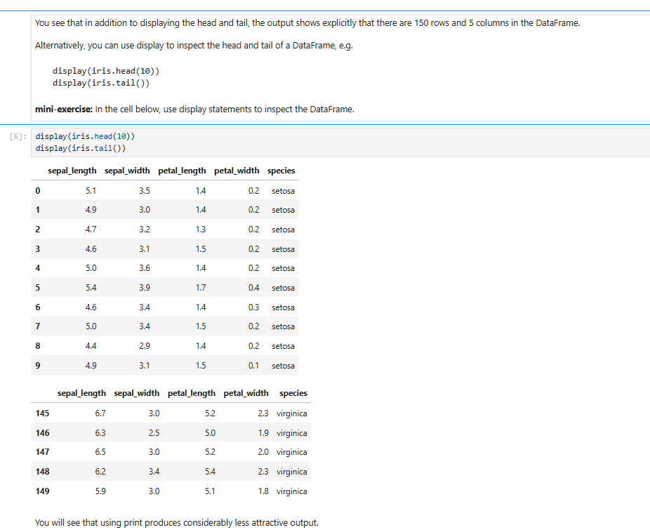 Cant view both at the same time use the name of the dataframe e.g. just “iris” to display both the first and last 5 entries in a data frame