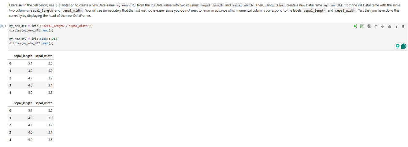 for the iris dataframe, display two new data frames where df1 contains the columns “sepal_length” and “sepal_width” using column name indexing and the second contains displays the same using slicing?