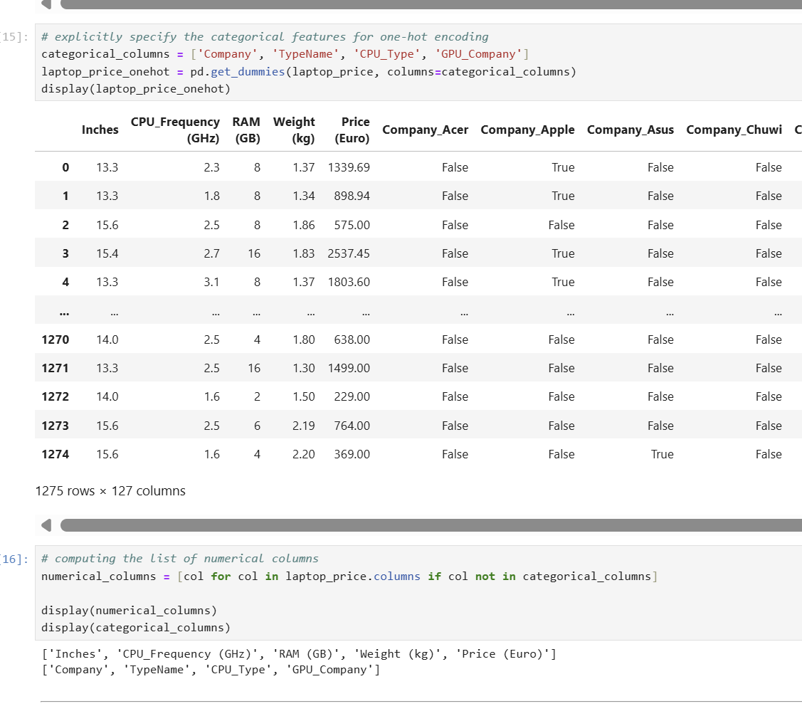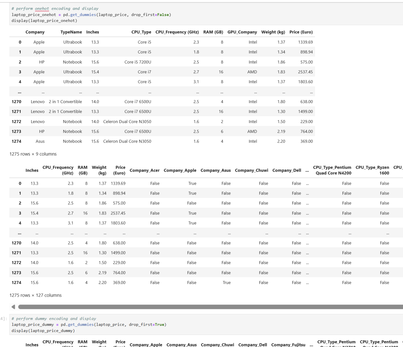 how would you code to perform one-hot and dummy encoding on a mixed data set laptop_price.csv?