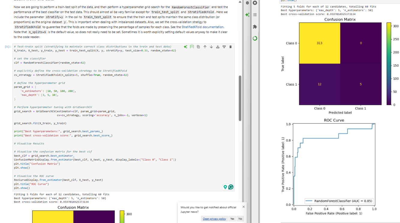 The RandomForestClassifer has a parameter class_weight. The “balanced” mode uses the values of y to automatically adjust weights inversely propotional to class frquencies in the input data –> setting class_weight = “balanced” should improve the the AUC to about 0.87 for this artifical data set