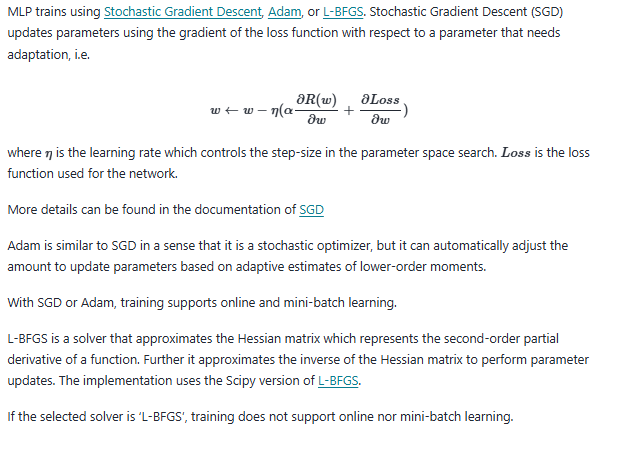 Note: The default solver ‘adam’ works pretty well on relatively large datasets (with thousands of training samples or more) in terms of both training time and validation score. For small datasets, however, ‘lbfgs’ can converge faster and perform better.