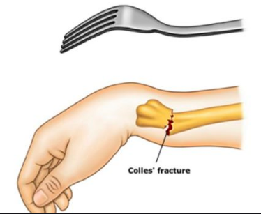 Fracture of the distla end of the radius -> “dinner fork” deformity: proximal radius is displaced anteriorly, with teh distal bone fragment displaced posteriorly.