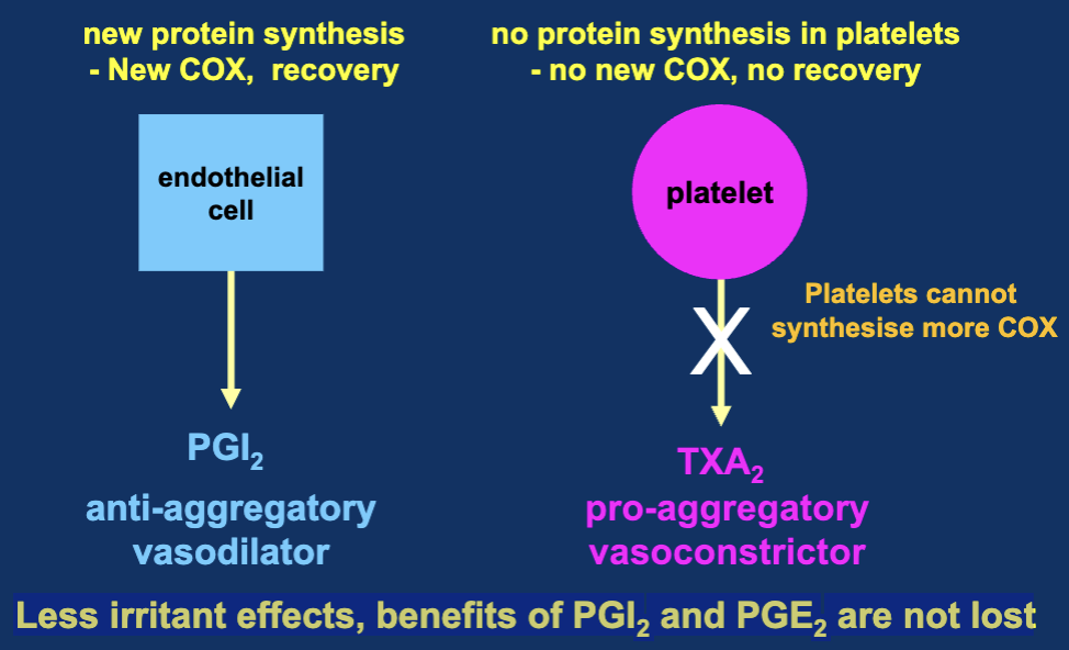 BUT these can make new COX enzymes (nucleus) and continue producing PGI2, a vasodilator that counteracts TXA2 mediated vc and aggregation.
