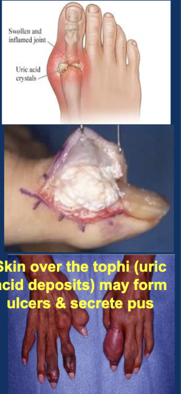 High concs of uric acid in the blood (hyperuricemia) cause tiny grit-like crystals to collect in the joints.