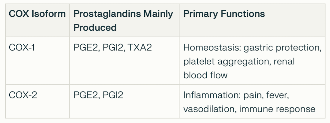 Name 2 types of prostaglandins and their associated COX enzyme?