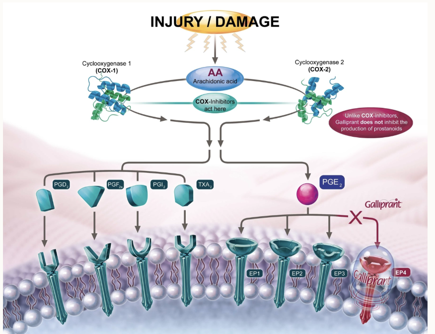 Grapiprant is a selective EP4 receptor antagonist, targeting PGE2-induced nociception without inhibiting COX enzymes