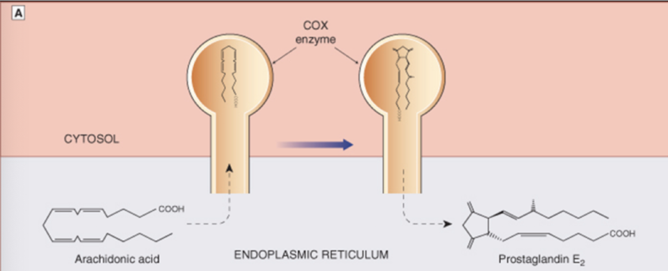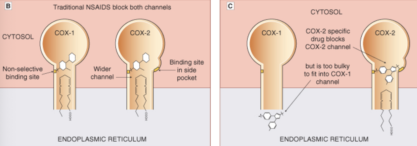 COX1 and COX2 –> inhibited by aspirin, NSAIDs, selective COX-2 inhibitors