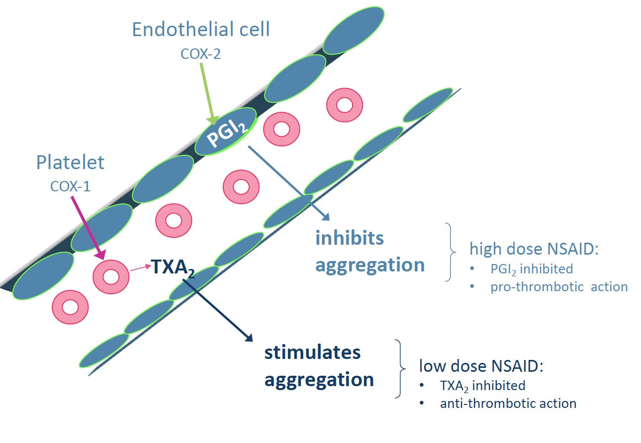 NSAIDs inhibit synthesis of thromboxanes (TXA2) –> inhibits platelet aggregation