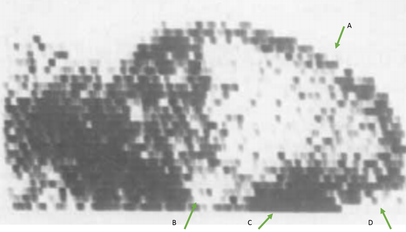 Species, abnormalities? What are the two ovoid regions of high activity? Assuming you can see the faint x region of activity labeled, name it.