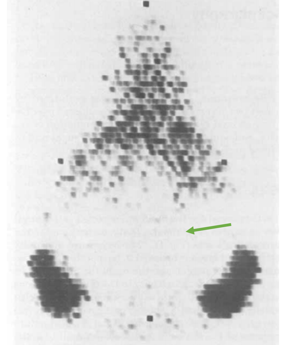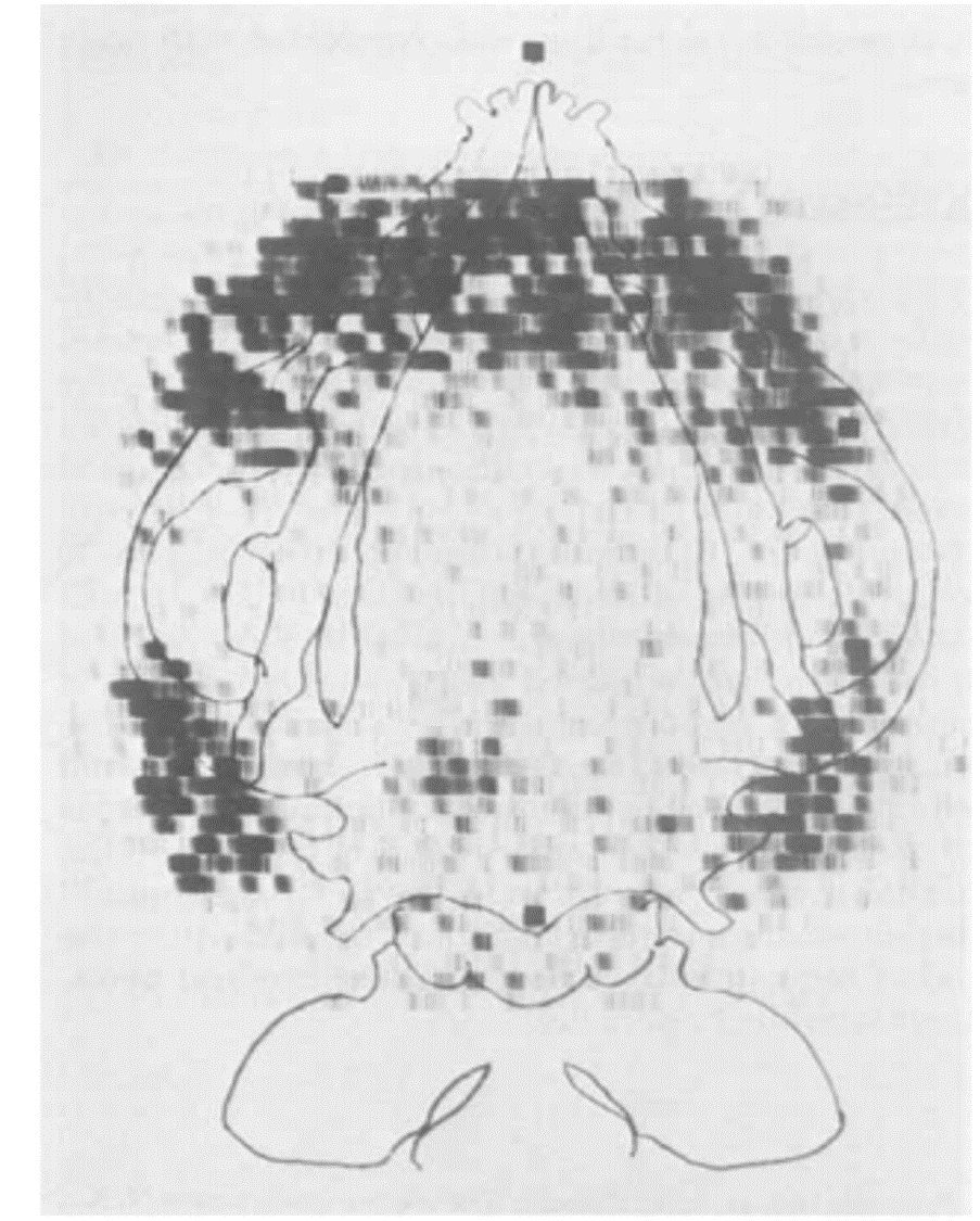 Canine, dorsal scan, area of increased uptake in cerebellar and medulla oblongata area