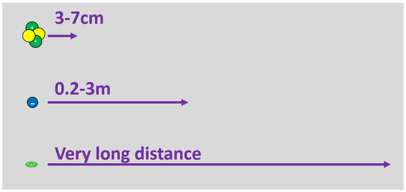 Alpha = 3-7cm Beta = 0.2-3m Gamma = Very long distance