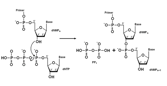 (DNA)n + dNTP ⇔ (DNA)n+1 + PPi