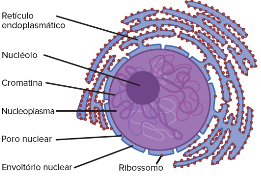 O envoltório nuclear possui duas camadas de membrana lipo proteica e poros por toda sua continuidade para permitir a entrada de determinadas substancias. Além disso, há a possibilidade de haverem ribossomos anexados na membrana externa devido a sua proximidade com o retículo endoplasmático rugoso.