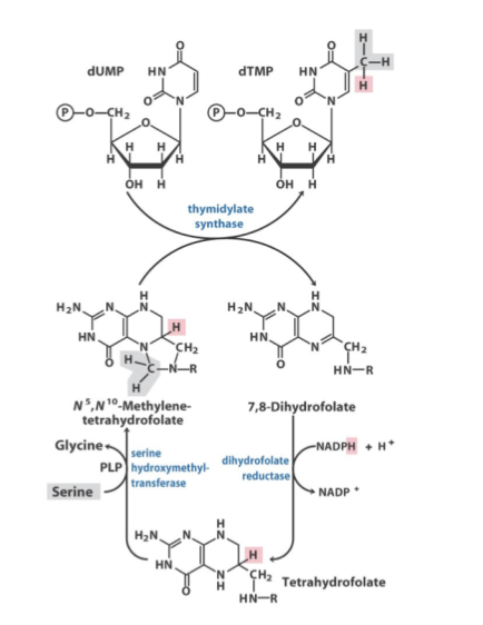 Thymidylat synthase methylerer dUMP til dTMP ved brug af N5,N10-methylene tetrahydrofolat, som omdannes til 7,8-dihydrofolat.