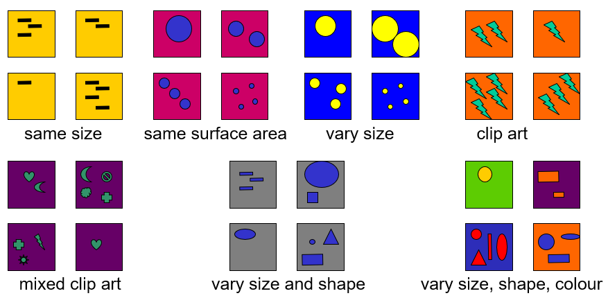 trained pigeons to discriminate between “few” (1/2 items) and “many” (6/7 items). But birds may be ignoring number, and instead using some other feature of the display such as: