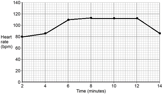 (a) Plot the information shown in the table on the graph paper below to show how heart rate has changed over time. Label the axes and join up the points to make a line graph.