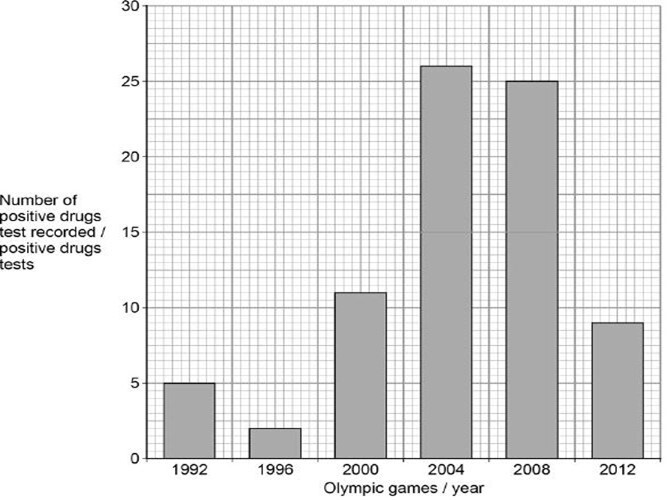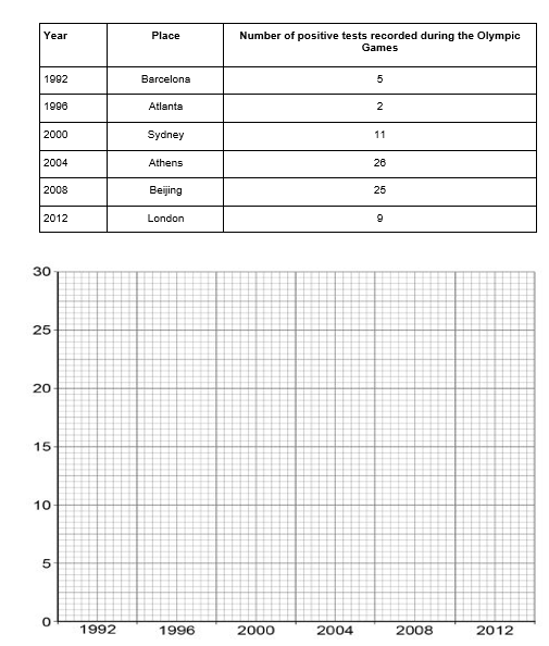 Draw a bar chart on the graph paper below to show the number of positive tests recorded at each Olympic Games.