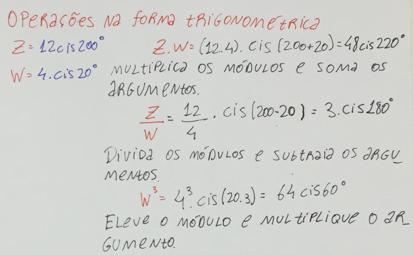 Como fazer multiplicação, divisão e potenciação de um número complexo na forma trigonométrica?