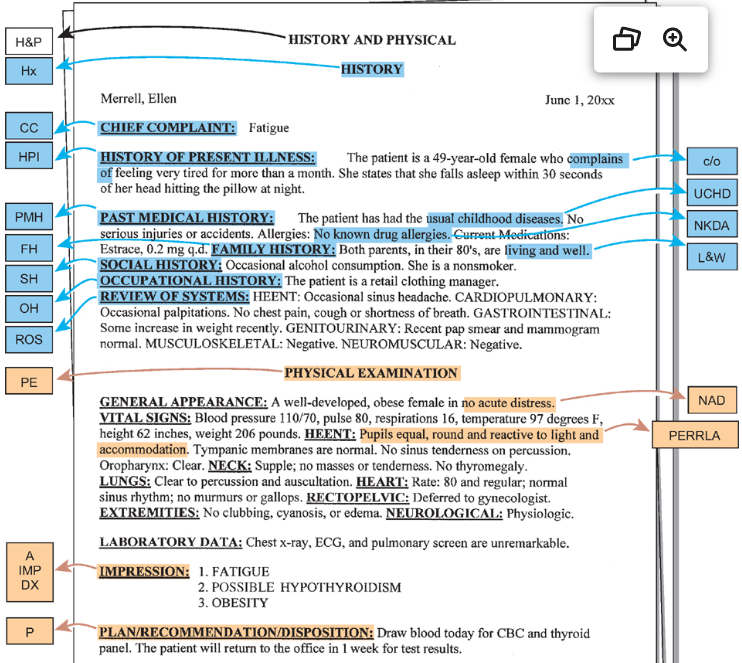 What is Hx, CC, PMH, FH, NKDA, PE on a patient chart?