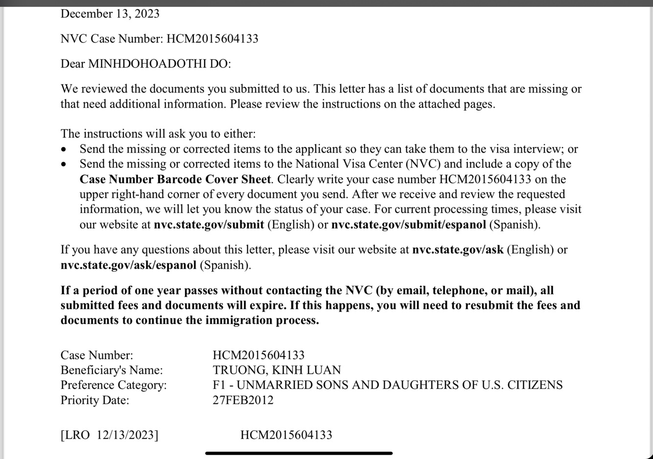 If you have further questions, please do not reply to this e-mail. Instead, please submit your inquiry to: https://vn.usembassy.gov/immigrant-visa-inquiry-form/.